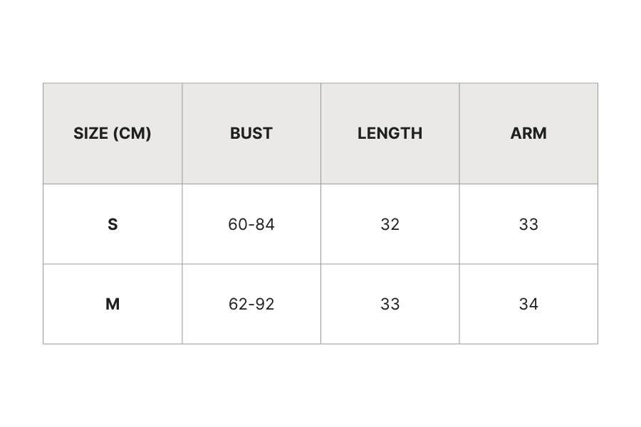 - M: bust 62-90cm; length 33cm; arm 34cm